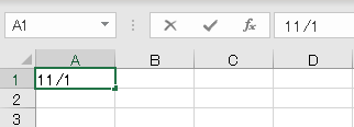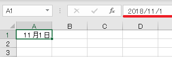 セル[A1]をアクティブセルにすると数式バーは「2018/11/1」となっています。