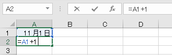 セル[A2]をアクティブセルにすると数式バーは「=A1+1」となっています。