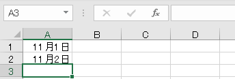 後は、セル[A2]の計算式を11月30日となるように、オートフィル機能を