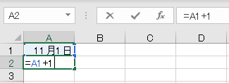 次にセル[A2]に「=A1+1」の計算式を入力します。